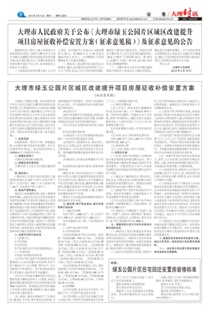 为加快下关城区改建,依法按程序进行绿玉公园片区城区改建项目房屋征收补偿安置工作,保障被征收人合法权益,根据《中华人民共和国土地管理法》、《中华人民共和国城乡规划法》、《中华人民共和国物权法》和国务院《国有土地上房屋征收与补偿条例》等法律法规以及《大理市城区改建提升实施办法(试行)》相关规定,结合绿玉公园片区城区改建项目房屋征收补偿工作实际,特拟定本补偿安置方案(征求意见稿)。