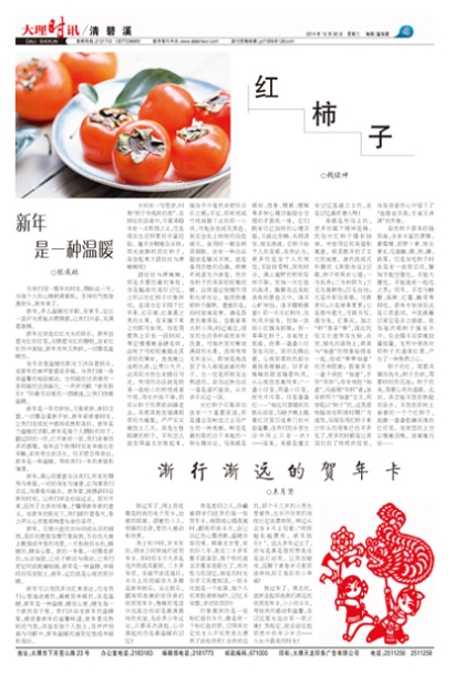 柿子的红,需要风霜的洗礼;柿子的软,需要时间的沉淀;柿子的美,需要心灵的通感。此刻,我怎能不想到熟稔的故乡,不想到那树上垂着的一个个红柿子,就像一盏盏慰藉灵魂的红灯笼,在家园的上空忘情地召唤,迷离地闪烁……
