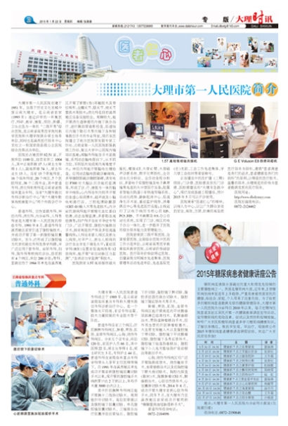 糖尿病是被联合国确定的重大和需优先控制的主要慢性病之一。我国是糖尿病大国,近年来,2型糖尿病发病率呈逐年上升趋势,严重危害着我国居民的健康,给社会、家庭、个人带来了沉重负担。为了给更多的糖尿病患者提供无偿的健康管理服务,大理市第一人民医院内分泌科自2010年以来,每月定期向住院患者及社区居民开展一次健康教育讲座宣传活动,宣传糖尿病的危险因素、症状以及预防和控制措施,呼吁广大市民和糖尿病患者多学习糖尿病健康知识,了解自身情况,做到早发现,早治疗。现继续公布2015年糖尿病患者健康讲座课程安排,欢迎广大市民前往参加!