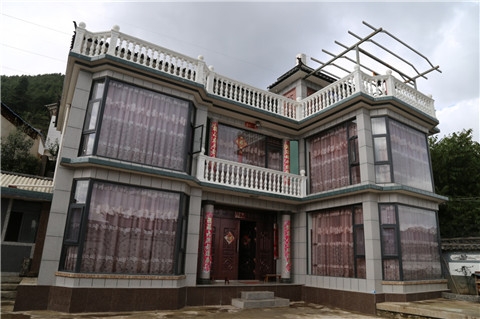 太邑乡者么村委会者么新村杨贵基户 在大山深处藏有这样一栋现代感强的建筑,让人眼前一亮。该建筑于2013年建成,占地面积250平方米,建筑面积240平方米,常住3口人。该建筑为新建农村居住型用房,房屋为二层半独栋小别墅,开敞式院落,现代住宅建筑风格,平屋顶,装饰有挑檐瓦屋面,建筑二层均采用落地窗,院内三滴水照壁围墙为白族建筑风格,住在此处,者么山风光尽收眼底,绘画精致,绿化简单,经济、实用是整栋建筑的亮点。