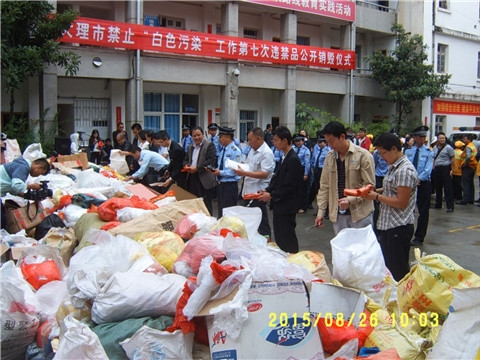 从那时起,我市成立禁止“白色污染”工作领导组,明确了职能部门的工作职责,为“禁白”工作的开展提供了坚强的组织保障。工作领导组成立后,工作人员先后深入社区、学校、企业、宾馆(酒店)、商场、超市、农贸市场和物流市场开展了全面调查。在广泛征求意见的基础上,编撰《大理市禁止“白色污染”宣传资料》、《关于在全市辖区禁止“白色污染”的告知函》、《大理市开展禁止“白色污染”集中整治行动告知函》、《大理市开展禁止“白色污染”工作剪影》、《突出节能减排,倡导绿色消费,建设美丽家园》和洱海治理保护及“禁白”宣传张贴画等宣传教育资料50万多份;设置“禁白”宣传牌356块,悬挂“禁白”宣传布标1550条;组织发放各种“禁白”替代品55万个、宣传品103万份;组织在展板、公交车、出租车、手机短信、电视、报纸、LED电子屏流动播放等多种形式不断向市民宣传“禁白”工作;在全市中、小学中开展“禁止白色污染,倡导绿色消费,建设美好家园”有奖征文活动,获奖作品编辑成《获奖征文集》,印制12000册发放到全市各中、小学校,倡导小手拉大手带动全社会形成绿色低碳生活的良好社会风气,在全市打响了一场“禁白”攻坚战。