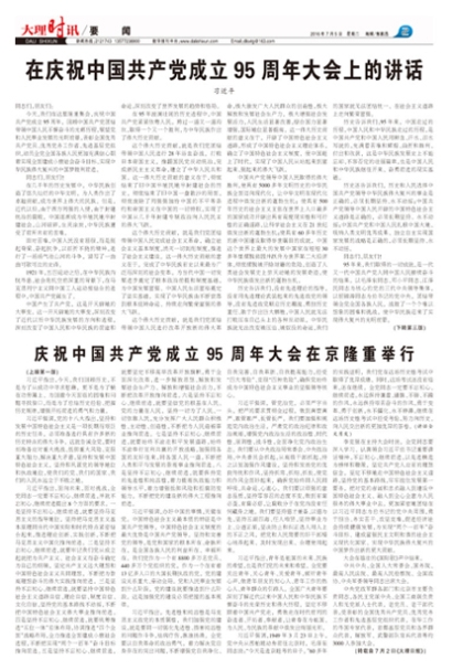 今天,我们在这里隆重集会,庆祝中国共产党成立95周年,回顾中国共产党团结带领中国人民不懈奋斗的光辉历程,展望党和人民事业发展的光明前景,表彰全国优秀共产党员、优秀党务工作者、先进基层党组织,动员全党全国各族人民更加充满信心朝着实现全面建成小康社会奋斗目标、实现中华民族伟大复兴的中国梦胜利前进。