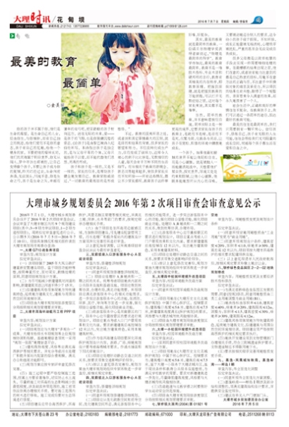 2016年7月1日,大理市城乡规划委员会召开了2016年第2次项目审查会议,会议审查了大理市辖区内的9个规划建设项目(其中:3—9项为审议项目,1—2项为通报项目),现将拟定审查意见进行公示,公示期5天(2016年7月5日—2016年7月10日)。项目具体情况和相关图件请到大理市规划局市规委办查询: