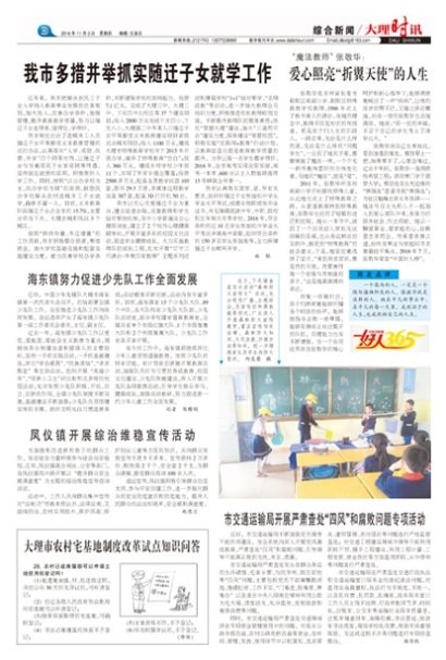 我市以关心关爱随迁子女为重点,建立信息台账,完善教师和学生结对帮扶机制,在中小学普遍设立心理咨询室,建立了2个校外心理健康辅导站,开展丰富多彩的校园文化活动,促进学生健康成长。大力实施教师队伍成长工程,扎实开展“甘守三尺讲台·争做四有教师”主题系列活动和薄弱学校“1+1”结对帮学、“名师送教”等活动,进一步加大教师全员培训力度,积极推进校长教师轮岗交流,不断提升教师队伍整体素质;依托“智慧大理”建设,加大“三通两平台”建设力度,探索建设“智慧校园”,积极实施“互联网+教育”行动计划,以教育信息化促进教育教学质量的提升,力争让每一名学生都学得好。2016年,全市高考实现全面突破,高考一本率、600分以上人数能够连续13年蝉联全州第一。