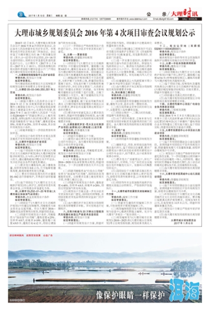 \2016年12月8日,大理市城乡规划委员会召开2016年第4次项目审查会议,会议由市人民政府副市长刘占华主持,市规委会成员单位及相关部门参加会议。会议审查了大理市辖区内的16个规划建设项目(其中:1—12项为审议项目,13—16项为通报项目)。现将拟定审查意见和通报意见进行公示,公示期5天(2017年1月6日—2017年1月10日)。项目具体情况和相关图件请登陆大理市信息公开门户网站或大理市规划局市规委办查询。