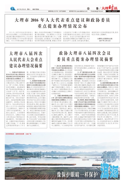 市人大八届四次会议及市政协八届四次会议期间,人大代表和政协委员通过提出建议和提案的形式,对全市经济社会发展提出了许多宝贵的意见和建议。市人大常委会确定了2件重点建议,市政协常委会确定了5件提案为重点督办提案。为认真做好人大代表建议和政协委员提案办理工作,广泛接受社会监督,全面提高人大代表建议和政协委员提案办复质量,根据《云南省人民政府关于办理人大代表建议和政协委员提案的办法》规定,经市人民政府研究,决定对2件重点建议和5件重点提案办理情况进行摘要刊登,欢迎社会各界人士监督,如有意见和建议,请及时向市人民政府督查室反馈,联系电话(传真):2128417。