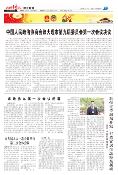 中国人民政治协商会议大理市第九届委员会第一次会议,于2017年2月5日至10日在下关召开。来自26个界别的252名委员参加了会议。市委、市人大、市政府、“两区一委”领导班子成员出席了会议,中央和省、州属驻关单位以及驻关部队首长,市政协历届离退休老领导应邀出席了会议,市级各部、委、办、局、司、行、社的负责同志列席了会议,中共大理州委大理市换届工作指导组到会作了指导。