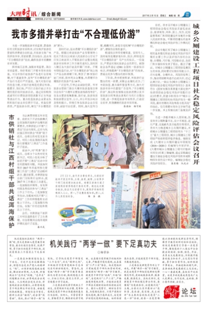 广泛宣传,引导企业诚信经营。州市旅游主管部门联合大理市旅游直客自律协会发布“大理州主要旅游线路指导价”,在各主要游客集散地、旅行社、旅游饭店和旅游景区宣传、公示,并公布投诉电话及维权提示,积极引导各旅游企业自觉自律、诚信守法经营。同时,加大宣传力度,提醒市民、游客自觉抵制“不合理低价游”,增强依法维权意识。
