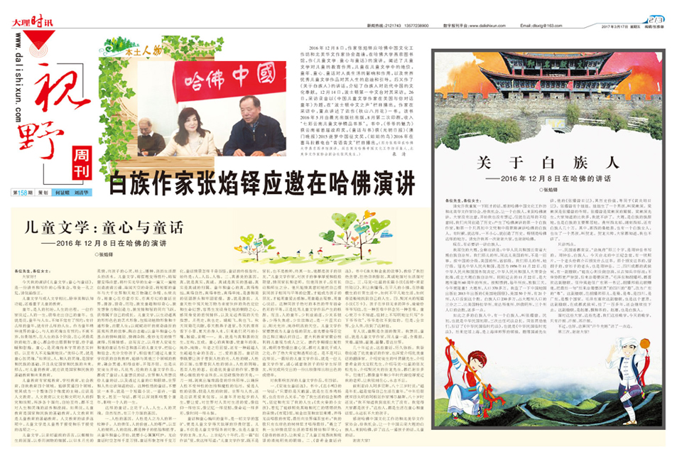 请允许我重复一下刚才的话,感谢哈佛中国文化工作坊和北美华文作家协会,给我机会,让一个白族人,来到哈佛演讲。大家没有注意,开始我也没有想过,但就在这样的不经意间,我们共同创造了历史:产生了哈佛演讲的第一个白族作家,和第一个只具初中文凭和中级职称演讲哈佛的白族人。有时候,就这样,一不小心,就创造了历史。特别是哈佛这样的地方。请允许我再一次谢谢大家,也谢谢哈佛。