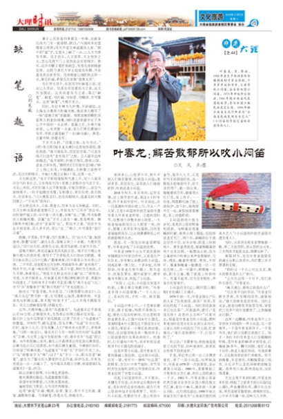 叶春龙1958年出生于南涧县保华镇拥政村叶家自然村,父亲是生产队队长,爷爷和父亲都会吹小闷笛,间或还弹一弹三弦。十多岁起,耳闻目染,叶春龙在放牛路上、放羊途中、砍柴苦累处、割叶寂寥中,便学着爷爷和父亲,吹起了小闷笛。