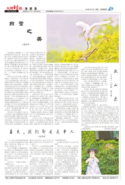 那时的人们对白鹭不以为奇,也少有加害,对她们的翔集就如同看见麻雀在身边聒噪,喜鹊在枝头报春,布谷在高空呼唤,黄鹂在柳间啼鸣。可是有很长一段时间,由于环境污染严重,白鹭再也不到我所在的那个乡村觅食、栖息、筑巢和嬉戏了,那优雅的身姿、明丽的色彩、动人的舞步、悦耳的鸣叫,最后都成为一种挂念、一种回忆、一种感喟,仅有的印象只是停留在画册中、相片上或者古典诗词里。“西塞山前白鹭飞,桃花流水鳜鱼肥”,是张志和见到的美景;“两个黄鹂鸣翠柳,一行白鹭上青天”,是杜甫看到的奇观;“漠漠水田飞白鹭,阴阴夏木啭黄鹂”,是王维目睹的胜境;“惊飞远映碧山去,一树梨花落晚风”,是杜牧眺望的意境。就连现代作家郭沫若欣赏到白鹭高飞的雅态,也不得不由衷地赞叹:“那雪白的蓑毛,那全身的流线型结构,那铁色的长喙,那青色的脚,增之一分由嫌长,减之一分则嫌短,素之一忽则嫌白,黛之一忽则嫌黑”;并称她为“一首精巧的诗,一首韵在骨子里的散文诗”,真乃言有尽而意无穷。
