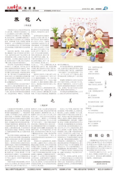 美的东西一般娇贵。花美,也挑剔。和土壤植物打交道、养花草的人是朴厚大气的。盛开的花朵,除了自己欣赏外,更多的是供他人欣赏,以给他人带去赏心悦目的美感。小肚鸡肠、狭隘的人是做不来的,纵使你说到口干舌燥,他也不会明白“赠人玫瑰,手留余香”的简单快乐。