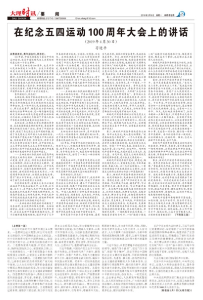 今年是五四运动100周年,也是中华人民共和国成立70周年。在这个具有特殊意义的历史时刻,我们在这里隆重集会,缅怀五四先驱崇高的爱国情怀和革命精神,总结党和人民探索实现民族复兴道路的宝贵经验,这对发扬五四精神,激励全党全国各族人民特别是新时代中国青年为全面建成小康社会、加快建设社会主义现代化国家、实现中华民族伟大复兴的中国梦而奋斗,具有十分重大的意义。