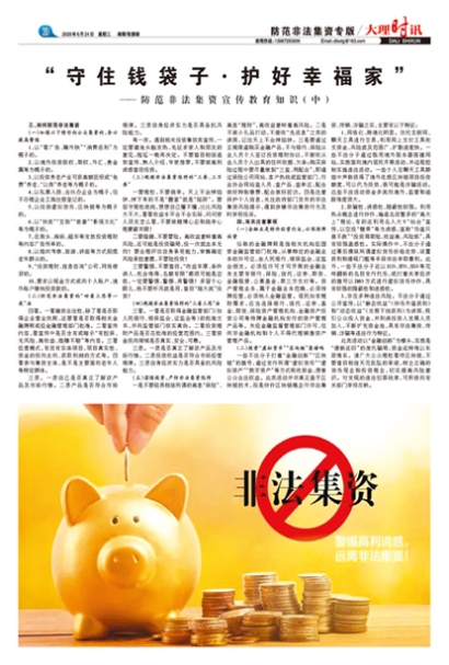 四看。一看融资合法性,除了看是否取得企业营业执照,还要看是否取得相关金融牌照或经金融管理部门批准。二看宣传内容,看宣传中是否含有或暗示“有担保、无风险、高收益、稳赚不赔”等内容。三看经营模式,有没有实体项目,项目真实性、资金的投向去向、获取利润的方式等。四看参与集资主体,是不是主要面向老年人等特定群体。