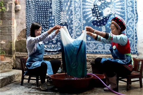 喜洲镇副镇长赵秋华介绍,喜洲镇是一个有着两千多年历史的白族文化名镇,这里的居民传承了丰富精湛的手工技艺。最近几年,喜洲镇依托白族传统的扎染技艺,引导本地手艺人发展体验式的乡村生态旅游,让游客不仅仅停留在走走看看,而是通过自己动手体验和感受白族文化。目前,以“蓝续”“璞真”为代表的扎染体验馆经过几年的打磨已经初步形成品牌效应,越来越多的游客慕名而来。同时对当地群众开展扎染技艺培训,让更多的村民加入到扎染队伍中,生产出更多更好适宜市场需求的高品质商品,扩大了白族扎染的知名度,传承了扎染技艺,也很好地促进了当地居民就业,增加村民收入。