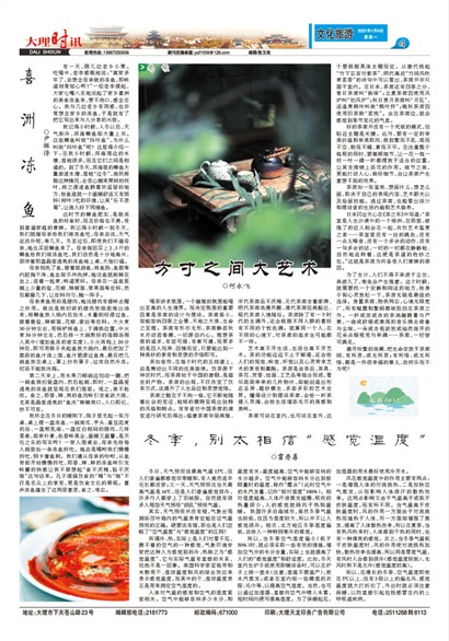 我怀念在冬日的暖阳下,院子里支起一张方桌,桌上摆一盘冻鱼、一碗南瓜、芋头、蚕豆泥煮的汤、一盘煎乳扇、一盘红白相间的腊肉,几样菜肴,简单朴素,色香味俱全,温暖又温馨,是天伦之乐的写实呀!一家人围桌坐,母亲先给每人碗里拈一条冻鱼拆吃。她总是嘱咐我们慢慢拆吃,别卡着鱼刺。我们遵从母亲的吩咐,从鱼脊部开始慢慢拆吃,那香、辣、鲜的冻鱼味引发味蕾的快感让我不禁想起“食不厌精,脍不厌细”这句话来。孔子提倡饮食的“精”与“细”不仅是舌尖上的享受,更是饮食文化的展现。喜洲冻鱼蕴含了这两层意思,食之,难忘。