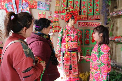 毕荷金花是来自弥渡县红岩镇清水村的彝族妇女,16岁时,她随同父母来到关迤社区居住,闲暇之余,她特别喜欢缠着母亲教她彝族传统刺绣技艺。2019年,毕荷金花参加了关迤社区的技能培训,不仅刺绣技能得到提升,也让她有了在关迤社区龙尾古街内创业的动力。2020年,毕荷金花在龙尾古街租下一间铺面,成为她制作绣品的工作室。在她的工作室里,有20多种传统的彝族刺绣工艺品,颇受当地居民和外地游客的青睐。工作室开业以来,毕荷金花接到了许多订单,每天都在工作室里忙着制作绣品。