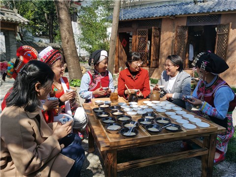 字丽介绍:“我们主要是以彝族、白族、汉族等几个民族联合起来做一些非遗文化的文创活动。今天我们有彝族的打歌、白族的三道茶。我们做文创园的目的就是把环境展现给远方来的客人,让他们来到这里可以体验到我们的民族风情文化。”