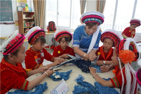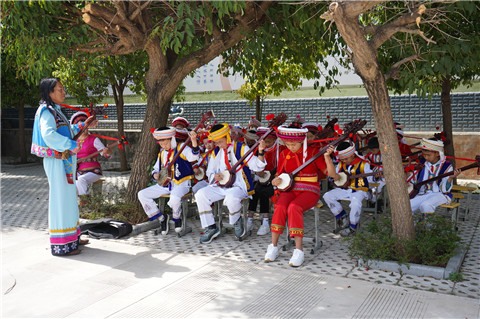 “苍山起舞,玉洱欢笑,大理真是一片好风光……”在大青树下,身着白族服装的学生正在老师的指挥下认真整齐地高歌白族歌曲,歌声在校园里久久回荡;在教室里,课桌上不再是厚重的课本和写不完的作业,取而代之的是扎染所需的各种布料和染料,扎花、印花、染花小组在老师手把手的指导下,诞生出一件件漂亮的扎染作品;在教学楼外,三弦小组的学生坐在树底下边乘凉边认真地听着省级非遗传承老师讲解三弦的构造、由来,并不时弹唱一首首优美的大本曲;在校门入口处的小广场上,小朋友们穿着民族服装跟着音乐欢快地跳着白族舞……这是周城完小近年来每次少年宫活动纪实。