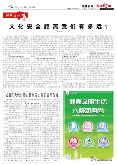 “所谓文化,包涵的不仅仅是语言、文字、文学、艺术等领域,它表述并支撑着一个国家与民族的文明体系。在特定的经济基础之上,文化诠释和界定人们的行为规范、道德准则、价值理念、政治信仰,为建立一个国家所必需的民族认同和政治认同提供了思想和精神基础。”《国家安全学》一书认为,文化安全包括语言文字的安全、风俗习惯的安全、价值观念的安全、生活方式的安全。可见,文化安全涉及我们生产生活的方方面面。