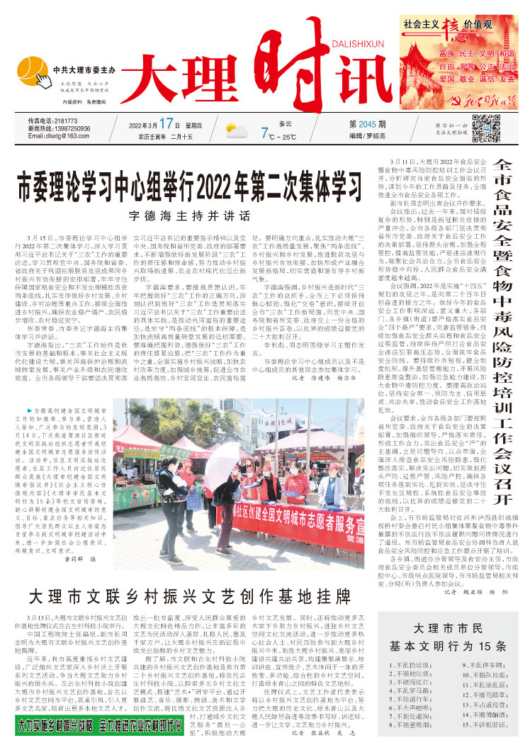 大理时讯时政要闻 市委理论学习中心组举行2022年第二次集体学习 全市食品安全暨食物中毒风险防控培训工作会议召开 图片新闻 大理市文联乡村振兴文艺创作基地挂牌 大理市市民基本文明行为15条