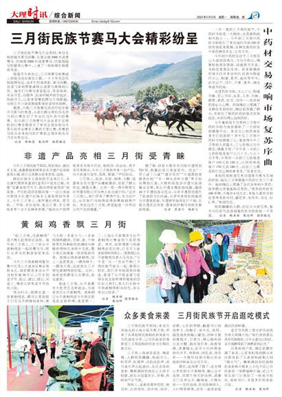 三月街上商铺店连店、摊连摊,人群熙熙攘攘、热闹非凡。叫卖声、吆喝声、讨价还价声、流行音乐声此起彼伏,各式各样的美食、琳琅满目的商品让人目不暇接,到处洋溢着欢乐、祥和、热闹的节日气氛。