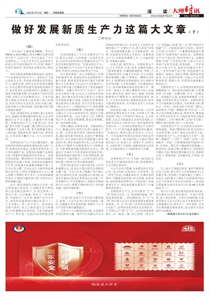 看今日中国,到处都是活跃跃的创造,到处都是日新月异的进步。未来已经到来,奋斗成就梦想。让我们深刻把握、认真贯彻落实习近平总书记关于发展新质生产力的重要论述,真抓实干、开拓进取,共同开创高质量发展新境界,奋力谱写中国式现代化新篇章。