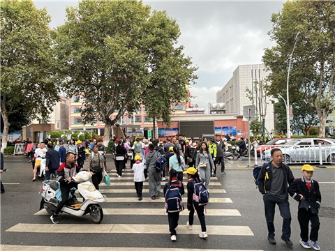 “过马路走斑马线,家长们牵好自己的孩子!”